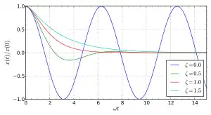 де ω0 це незгасна кутова частота осцилятора і ζ відома як коефіцієнт згасання. Це рівняння чинне для багатьох коливальних систем, але з різними формулами для швидкості згасання і незгасної кутової швидкості.