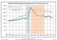 Динаміка населення з 1875 року в сучасних кордонах (Синя лінія: населення; Пунктир: відносна порівняльна динаміка населення землі Бранденбург; Сірий фон: період Третього рейху; Помаранчевий фон: період НДР)