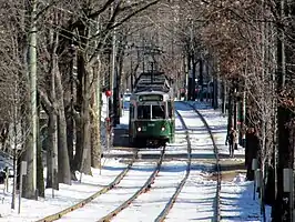 - Маршрут B також відомий як Лінія Авеню Співдружності — має 24 станції (6 підземних), відкрився у 1894—1900 роках. Починається в центрі на станції «Парк-стріт», де можливо пересісти на потяги Червоної лінії метро. Після проходження підземної ділянки, виходить на поверхню через портал Блендфорд-стріт та прямує на захід. Маршрут обслуговує великі навчальні заклади, такі як Бостонський університет та Бостонський коледж. Західна кінцева станція — «Бостонський коледж».