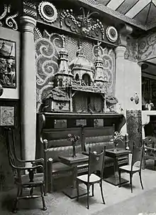 У проектуванні інтер'єру кав'ярні взяли участь Кароль Фрич і Францішек Мончинський: з'явилися Зелена зала (Фричева зала) i Гірка — зала і сцена кав'ярні. На стінах розміщувалися роботи Кароля Фрича і Казимєжа Сіхульського, фрески, карикатури, у нішах — ляльки і вертеп. Меблі у кав'ярні витримані у стилі сецесії, використовуються вітражі.