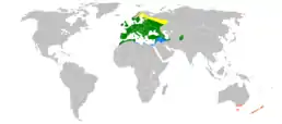 ![]() Ареал поширення зеленяка Осіле проживання Гніздування Зимування Інтродуковані популяції | ||||||||||||||