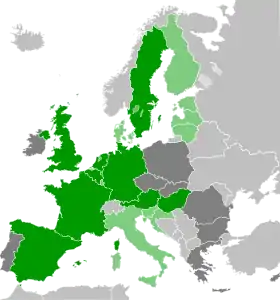 Депутати Європарламенту з фракції «Зелені — ЄСА» з 15 країн, у тому числі 11 з більш ніж одним (темно-зелений) і 4 з одним (світло-зелений)