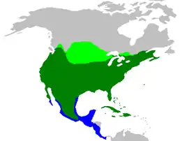 Багамські острови, Беліз, Бермуди, Канада, Кайманові острови, Колумбія, Коста-Рика, Куба, Домініканська Республіка, Сальвадор, Гватемала, Гаїті, Гондурас, Ямайка, Мексика, Нікарагуа, Панама, Пуерто-Рико, Сен-П'єр і Мікелон, Теркс і Кайкос, Сполучені Штати. Ареал майже на 11 мільйонів квадратних кілометрів. Приблизна кількість особин даного виду: 475 000 000. На нього полюють як для спорту так і м'яса.