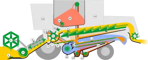Ріжучий апарат жниварки (2) зрізає стебла, мотовило (1) укладає їх на платформу жниварки, шнек (3) транспортує зрізану хлібну масу до центру жниварки і пальцями, які є в центральній частині, проштовхує у похилий корпус (4), де стебла подаються транспортером. Вже в корпусі самого комбайна перед молотильним барабаном (6) є каменевловлювач (5), в який під дією гравітації із хлібної маси випадають камінці. Молотильний барабан проводить обмолот колосків, вимолочене зерно, полова та дрібні домішки просипаються крізь деку (7) на транспортувальну ґратку (9). Солома і зерно, що залишилося в ній недомолоченим, викидаються на клавіші соломотряса (8), де за рахунок вібрації і зворотно-поступального руху клавіш, а також їх спеціальної конструкції відбувається відділення зерна від соломи і воно просипається на решето (11). Вентилятором (10) під решето подається повітря, потоком повітря зерно очищається від легких домішок. Солома по соломотрясу надходить до подрібнювача (17) або копичника (на схемі відсутній, встановлюється замість подрібнювача). Очищене зерно зсипається в камеру зернового шнека (15), який подає зерно в бункер (16). Недомолочене колосся по ґратці надходить на піддон, по якому воно зсиплеться у колосовий шнек (13), який повертає колосся в молотильний барабан[3].