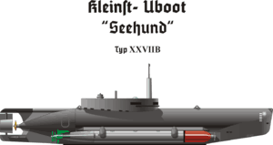 На початку 1945 року до серійного випуску була підготовлена підводний човен типу «Kreislauf Seehund» («Зеехунд» із замкнутим циклом дизеля). Більш досконала рухову установка мала значно кращі маскувальні властивості. Довжина корпусу мінісубмарини склала 13,3 метрів. Одночасно був спущений на воду дослідний зразок мінісубмарини типу «Косатка» (нім. «Schwertwall»). Вона оснащувалася парогазової турбіною Вальтера, що дозволяла розвивати під водою швидкість до 30 вузлів. Дальність плавання становила 100 миль. Озброєння — дві 533-мм торпеди.