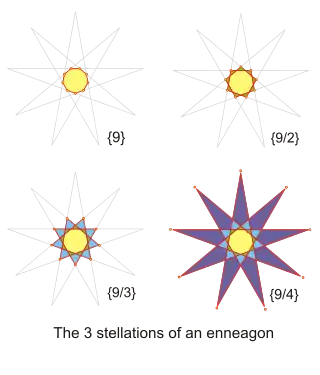 ![]() Дев'ятикутник {9} має 3 еннеаґрамні форми: |