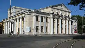 Перед війною 1941—1945 рр. театр було реконструйовано за проектом архітектора О. Л. Красносельського. Він набув більш класичних форм, його фасад прикрасили колони, пілястри та скульптурні зображення муз мистецтва.