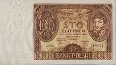 | 100 злотих | 138 × 69 мм | Темно-зелений | Владислав II Ягайло | Щит що містить Білого Орла з надгробка могили Владислава Ягайло, шолом та два грюнвальдські мечі | 1 червня 1995 | |
