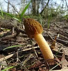 Полодові тіла прямостоячі, до 10-15 см висотою. Шапинка дзвіночкоподібна, 2-5 см висотою, 2-5 см в діаметрі, жовтувато-бура, вохряна, з тісно розташованими складками, що з'єднуються поперечними відгалуженнями, приросла до ніжки, з вільними краями, зверху породовгувато-зморщена, знизу гладка, білувата.