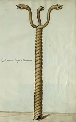 | Так вони нагромадили там дорогоцінні речі, а потім виділили з них десяту частину для дельфійського бога і з неї були приношення такі, як золотий триніжник, поставлений на бронзового триголового змія поблизу жертовника (IX, 81) |