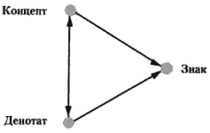 Німецький філософ та логік, один із засновників логічної семантики Готлоб Фреге представив співвідношення між денотатом, концептом та знаком у вигляді трикутника, який демонструє залежність знаку як від об'єктивно існуючої реальності (денотат), так і від суб'єктивних уявлень про цю реальність (концепт).