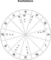 | Екзальтація | Сонце | Місяць | Меркурій (Церера) | Юпітер | Плутон | Меркурій | Сатурн | Уран | Ерида | Марс | Нептун | Венера |