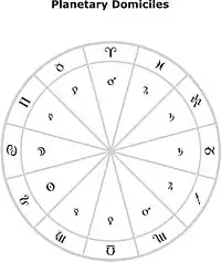 | Доміциль | Марс | Венера (Земля) | Меркурій | Місяць | Сонце | Меркурій (Церера) | Венера (Ерида) | Марс (Плутон) | Юпітер | Сатурн | Сатурн (Уран) | Юпітер (Нептун) |