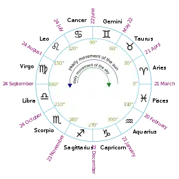 У західній астрології астрологічні знаки є дванадцятьма 30° секторами екліптики, починаючи з точки весняного рівнодення (один з перетинів екліптики з небесним екватором), також знана як перший градус Овна. Порядок астрологічних знаків такий: Овен, Телець, Близнюки, Рак, Лев, Діва, Терези, Скорпіон, Змієносець, Стрілець, Козоріг, Водолій і Риби.
