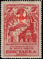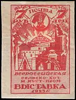 Перша серія з чотирьох поштових марок Союзу Радянських Соціалістичних Республік була присвячена Першої Всеросійської сільськогосподарської і промислово-кустарної виставці в Москві, представлена слайдами, яки були надруковані літографським способом на простому білому папері з зубцями і без зубців. Перші знаки поштової оплати із зазначенням держави СРСР продавалися на виставці в спеціальних поштових відділеннях протягом всього одного місяця: 15 вересня в зв'язку з введенням нових поштових тарифів їх продаж було припинено. Випуск був здійснений Головним виставковим комітетом, за угодою з Організацією Уповноваженого з філателії і бонам (особливої секцією при Всеросійському комітеті сприяння сільському господарству ВЦВК) та Народним комісаріатом пошти і телеграфів СРСР. Відомі також варіанти на сірувато-кремовом папері. Таким чином, першою емісією поштових марок СРСР стала «виставкова» серія, яка була випущена за розпорядженням радянського уряду[3].