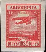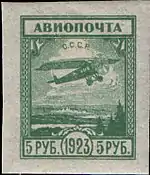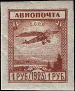 Крім того, з 1 серпня 1923 року випускалися перші авіапоштові марки СРСР чотирьох номіналів в золотій валюті, розміром 21×25,5 мм на марочних аркушах (5×5 примірників на кожному аркуші). Перші авіапоштові марки СРСР були підготовлені до жовтня 1923 року, однак у зв'язку з настанням осені і припиненням польотів до весни такі знаки поштової оплати до обігу не надійшли. Навесні 1924 року у зв'язку зі зміною курсу валюти та разом з нею поштових тарифів, на марках випуску 1923 була проведена друкарська надпечатка чорного кольору нового номіналу (5; 10; 15; 20 копійок золотом). Серія вийшла в обіг тільки в травні 1924 року і використовувалася для оплати поштових відправлень, що пересилаються авіапоштою[8][9].
