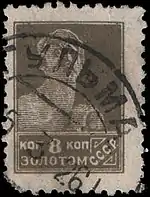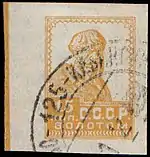 - Портрет В. І. Леніна, темно-фіолетова. Металографія на щільному папері із водяним знаком «килим», перфорована: зустрічається декілька варіантів лінійної зубцовкі: 10½, тобто на кожні 2 сантиметри краю марки припадає 10½ зубців (ЦФА № 221) та 12½, тобто на кожні 2 сантиметри краю марки припадає 12½ зубців (ЦФА № 221а). Марки без зубців офіційно до обігу не надходили[1][11][12].