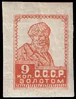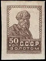 - Портрет В. І. Леніна, коричнева (ЦФА № 220) та сіро-коричнева (ЦФА № 220а). Металографія на щільному папері із водяним знаком «килим», перфорована: зустрічається декілька варіантів лінійної зубцовкі. Марки без зубців офіційно до обігу не надходили[1][11][12].