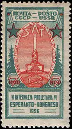 - Міжнародний конгрес есперантистів в Москві («Обеліск Радянської Конституції в Москві»). Червона, синьо-зелена. Літографія на щільному папері із водяним знаком «килим», перфорована: комбінована гребінчата зубцівка 12:12½ (тобто на кожні 2 сантиметри краю марки припадає 12:12½ зубців), 40 (8×5) примірників на маркових аркушах[1][8].