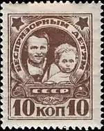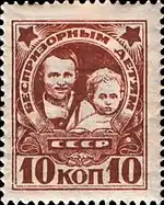 - На допомогу безпритульним дітям («Діти»). Корічневвая. Літографія на щільному папері без водяного знака, перфорована: рамкова зубцівка 13½ (тобто на кожні 2 сантиметри краю марки припадає 13½ зубців). По 100 (10×10) примірників на маркових аркушах[1][8].