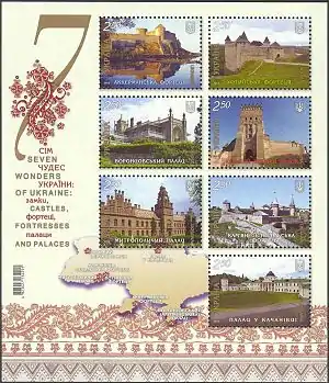 - Малий аркуш «Сім чудес України: замки, фортеці, палаци» з семи марок 2012 р... КМД УДППЗ «Укрпошта». poshta.kiev.ua. Архів оригіналу за 18 квітня 2018. Процитовано 18 квітня 2018.