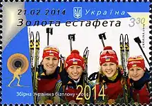 Збірна України з біатлону-2014. Золота естафета. 21.02.2014.: на марці зображено фото жіночої збірної України з біатлону. На купонах зображено фото: | 3,30 гривні |