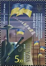 - Блок «Перші українські поштові марки доби визвольних змагань 1917-1921 років» з двох марок. КМД УДППЗ «Укрпошта». poshta.kiev.ua. Архів оригіналу за 11 грудня 2018. Процитовано 20 жовтня 2018.