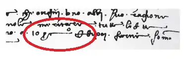 У XV столітті абревіатуру стали записувати як «pc» з невеликим колом в кінці, що позначає кінцеву букву (в італійській на неї закінчувалися числівники, наприклад primo, secondo тощо). Перші вживання виявлені у доповненнях до тексту 1425 року, ймовірно зроблених близько 1435 року.