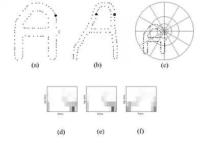 визначається як форма контексту . Стовпчики гістограми (англ. – bins) зазвичай приймають рівномірними в полярних координатах. Підтвердження факту, що форма контексту є характерним ідентифікатором, можна побачити на малюнку нижче, де зображено форми контекстів двох різних варіантів написання літери «А».