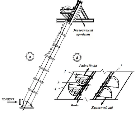 Зневоднювальний елеватор (рис.) складається з двох тягових ланцюгів 1 з прикріпленими до них перфорованими ковшами 2. При русі ланцюгів ковші поблизу нижньої зірочки елеватора зачерпують матеріал і транспортують його до верхньої зірочки. Передня стінка ковша – перфорована, а бокові суцільні. При русі ковшів вода проходить через отвори у перфорованій стінці і стікає в корпус 4. Процес зневоднення починається після того як навантажений ківш підніметься над рівнем води, що заповнює нижню частину елеватора. Довжина зони зневоднення повинна бути не менше 4 м по вертикалі. При русі ковшів вода проходить через отвори в стінках і стікає у кожух елеватора. Зневоднювальні елеватори випускають двох типів: із розосередженим ЕО і з зосередженим кріпленням ковшів ЕОС. Для попередження стоку води з верхнього ковша у нижній елеватори з розосередженим кріпленням ковшів установлюють під кутом нахилу 60–70º, в елеваторах із зосередженим кріпленням ковшів, які встановлюють під кутом нахилу до 75º, передбачений водовідвідний лист 3.