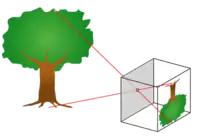 У більшості мов слово «камера» веде своє походження від терміна камера-обскура, що означає найбільш раннє з пристосувань для відображення навколишніх предметів. Камера-обскура була світлонепроникною кімнатою або ящиком з отвором в одній зі стінок. За рахунок прямолінійності поширення світла на протилежній стінці утворюється перевернене дійсне зображення. Перша в історії фотографія «Вид з вікна в Ле Гра», зроблена Нісефором Ньєпсом близько 1826 року за допомогою такої камери. Надалі замість простого отвору стали використовувати збірну лінзу, а пізніше її замінили більш досконалим об'єктивом. На протилежній стінці кріпиться фотоматеріал або фотоматриця.