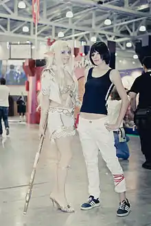 - Фантазія про силу як гендерний перформанс з гетеронормативної перспективи: чоловіча сексуальність розглядається як зворотний бік мужності. Зображення чоловіків як об'єктів бажання кодуються виключенням фемінних рис, суєтності і уваги до власної зовнішності, або квір-кодами, часто зображуваними як гумористичні.[46] Архетип бісьонен є прикладом такого зображення, як і персонажі типу Веги з Street Fighter, Mettaton з Underhate, Максі і Рафаеля з Soul Calibur, і Сефірот з Final Fantasy VII.
