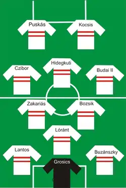 Очолив золоту збірну Ґустав Шебеш. Найчастіше «Золота команда» грала в такому складі: воротар — Дьюла Ґрошич, правий захисник — Єне Бузанскі, центральний захисник — Дьюла Лорант, лівий захисник — Міхай Лантош, правий півзахисник — Йожеф Божик, левій півзахисник — Йожеф Закаріаш, правий крайній нападник — Ласло Будаї, правий інсайд — Шандор Кочиш, центральний нападник — Нандор Хідегкуті, лівий інсайд — Ференц Пушкаш, лівий крайній нападник — Золтан Цибор. Формально схема 3–2–5, але підбір виконавців дозволяв трансформувати схему залежно від ходу матчу та суперника.