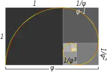 Якщо довжина сторони квадрата дорівнює 1, то наступний менший квадрат має сторони довжиною 1/φ. Наступні — 1/φ², 1/φ³ і так далі.