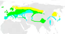 ![]() Ареал поширення жовточубої золотомушки Гніздування Осіле проживання Зимування | ||||||||||||||||||||