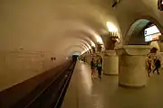 Станція складається з підземного залу, надземного і проміжного вестибюлів, з'єднаних ескалаторами, які утворюють цілісний архітектурний ансамбль. Ошатно вирішено підземний зал. Його композиція основана на поєднанні арково-склепінчастих елементів, що спираються на приземкуваті, круглі колони, увінчані стилізованими візантійськими капітелями. У декоративному оформленні використано мозаїчні панно, які розповідають про історію Київської Русі. Дві великі композиції розміщено у торцях середньої нави; в арках, що з'єднують колони — мозаїчні зображення київських князів і давньоруських храмів. Велику роль в організації простору центральної нави підземного вестибюля відіграють масивні металеві люстри, що нагадують світильники давніх храмів. Підлогу викладено з плит темно-сірого граніту.