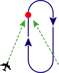 - Прямий вхід здійснюється так як зветься ― борт прямує до радіонавігаційної точки (holding fix) й відразу починає перший вихідний (outbound) розворот.