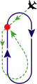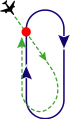 - У зміщеному (краплеподібному) вході борт летить на радіонавігаційну точку, пролітає діагонально закритий (внутрішній) простір ЗО, летить протягом хвилини, розвертається і прямує по вхідному відрізку до точки, звідки починає основну частину процедури.