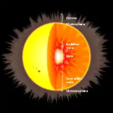 Гамма-квант, що приходить з сонячного ядра, поглинається частинкою речовини (атомним ядром чи вільним протоном), після чого збуджена частинка випромінює новий квант світла. Цей фотон має напрямок, ніяк не залежний від напрямку поглинутого фотону і може як проникнути в наступний шар плазми в променистій зоні, так і переміститися назад, в нижні шари. Через це проміжок часу, за який багатократно перевипромінений фотон (що початково виник в ядрі) досягає конвективної зони, може досягати мільйонів років. В середньому цей строк становить 170 тисяч років (для Сонця).[2]