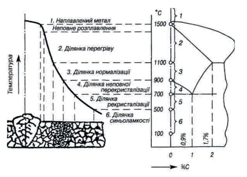 Зона термічного впливу складається з декількох структурних ділянок, які відрізняються за формою і будовою зерен.