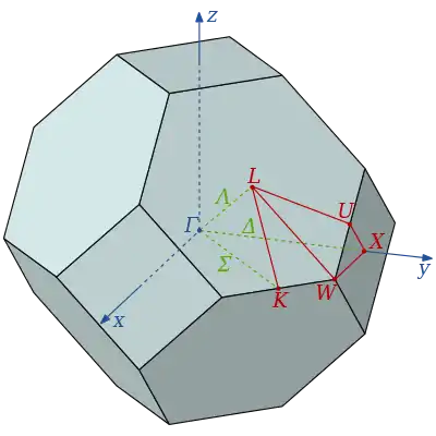 На рисунку праворуч схематично зображені валентна зона та зона провідності для кристалу арсеніду галію - популярного матеріалу в електроніці. Арсенід галію має кубічну гранецентровану ґратку. Перша зона Брілюена для цієї ґратки Браве зображена нижче.