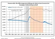 Динаміка населення з 1875 року в сучасних кордонах (Синя лінія: населення; Пунктир: відносна порівняльна динаміка населення землі Бранденбург; Сірий фон: період Третього рейху; Помаранчевий фон: період НДР)