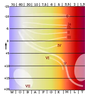Найчисленніший клас зір становлять зорі головної послідовності, що перетинає діаграму від правого верхнього кута до лівого нижнього. Саме до таких зір належить і наше Сонце. З еволюційного погляду головна послідовність — це те місце діаграми Герцшпрунга-Рессела, на якому зоря перебуває більшу частину свого існування. У цей час витрати енергії на випромінювання компенсуються за рахунок енергії, що виділяється в термоядерних реакціях перетворення гідрогену на гелій. Час перебування на головній послідовності визначається масою. Чітко виділяються кілька гілок зір, що вже минули стадію головної послідовності (гіганти, надгіганти). У них відбувається «горіння» гелію та важчих елементів. Вони розташовані вище головної послідовності, ці зорі належать до I—IV класів світності. У нижній частині діаграми розташовано білі карлики, що проеволюціонували майже повністю. Вони мають VII клас світності.