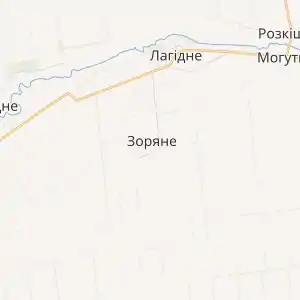 Селище Зоряне розміщене за 2,5 км від лівого берега річки Юшанли, на відстані 2 км від села Лагідне.
