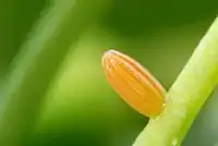 Яйця відкладають на кормові рослини, біля основи квітки або в розкриту оцвітину, по одному яйцю на рослину, а також впорскують поряд феромон, який дозволяє іншим метеликам уникати таких рослин.[4] Яйця близько 1 мм у довжину, видовжені. При відкладанні білого кольору, через добу стають рожево-помаранчовими, пізніше більш яскраво червоними. Перед вилупленням личинок стають темно-бурими. Від кладки до вилуплення проходить 7-12 днів, залежно від погоди.[5]