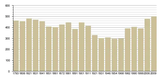 Динаміка населення (base Cassini de l'EHESS pour les nombres retenus jusque 1962[3], base Insee à partir de 1968 (population sans doubles comptes puis population municipale à partir de 2006)[4] · [5] ):