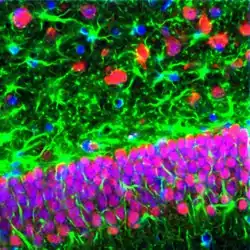 Окрім нейронів велику долю об'єму молекулярного та поліморфного шарів (і значно меншу — в гранулярному шарі) займають клітини астроглії (див. Рис. 5).