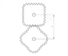 - m — модуль колеса — є стандартизований[10][11] найголовніший параметр. Визначається з розрахунку на міцність зубчатих передач. Має, також, враховувати умови експлуатації (наприклад абразивність оточуючого середовища, тип мащення і т. ін.). — Чим більш навантажена передача, тим вищим вибирається значення модуля. А далі через нього визначається решта всіх параметрів. Модуль вимірюється в міліметрах і обчислюється за формулою: