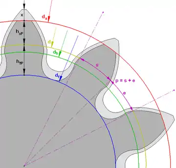 - p — крок зубів по ділильному колу (позначений фіолетовим кольором)