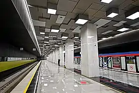Колійні стіни оздоблені панелями чорного, жовтого та темно-сірого кольору. Стеля станції прикрашена великими геометричними панелями з підвісними світильниками. Динамічна композиція створює ілюзію стелі, що рухається, при русі по платформі. Колони на платформі оздоблені світло-сірим мармуром, підлога викладена гранітом та чорним габро-діабазом. Касовий блок виконано із каменю помаранчевого кольору[3].